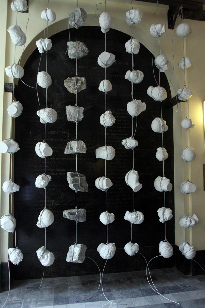 22 maggio 2014. L’installazione dell’artista Jannis Kounellis donata alla Fondazione IRCCS Ca’ Granda Ospedale Maggiore Policlinico di Milano, esposta nell’atrio della clinica Mangiagalli a Milano.