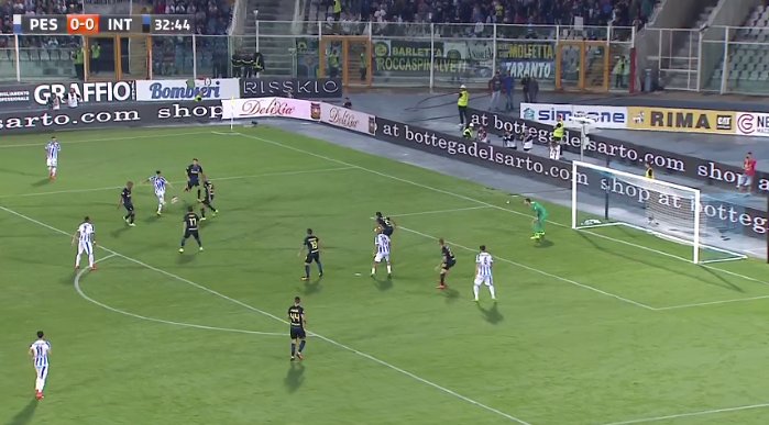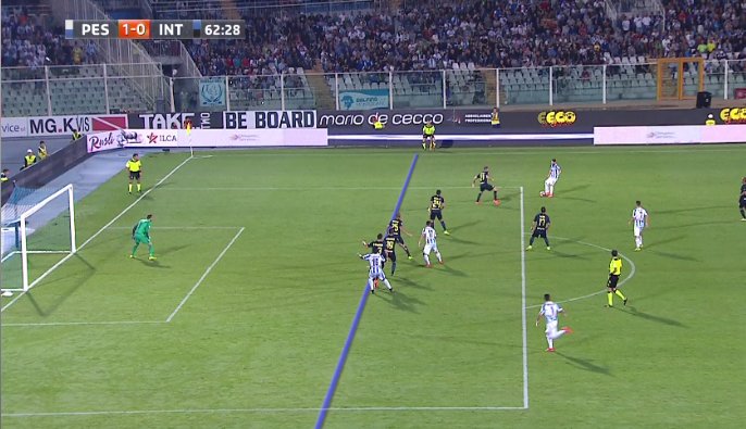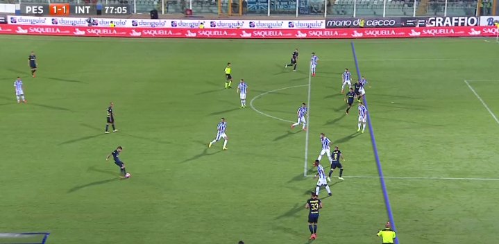 Verre servito in posizione regolare nel contropiede che si concluderà con la traversa colpita dal giocatore del Pescara