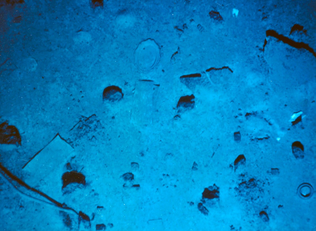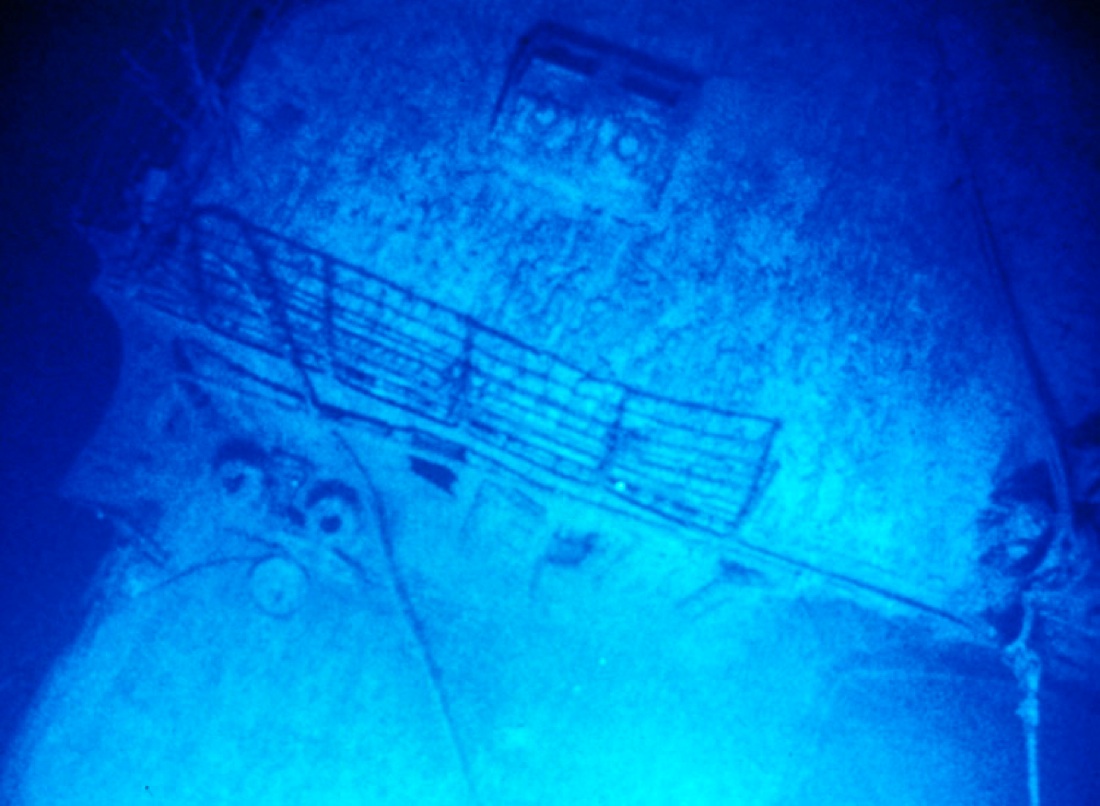 Le macchie scure sono bottiglie di vino sul ponte del Titanic inquadrate durante la spedizione del 1985.