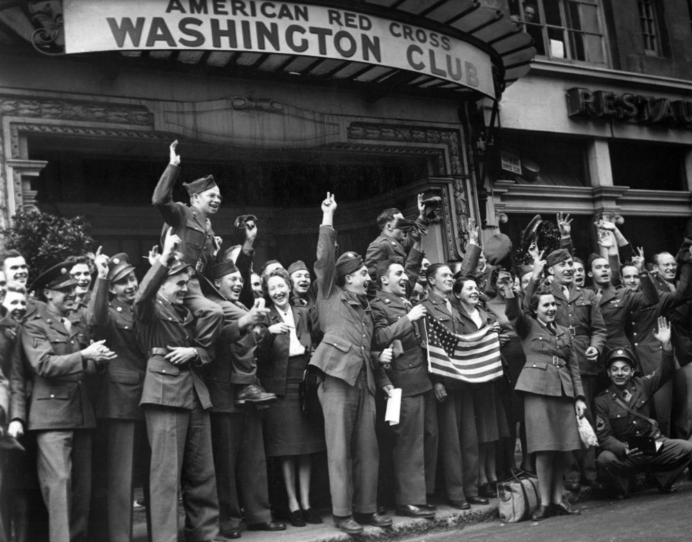 Londra, 8 settembre 1943. Esultanza per la resa italiana: davanti alla sede del club della Croce Rossa di Washington, alcuni militari esultano per la resa dell’Italia.