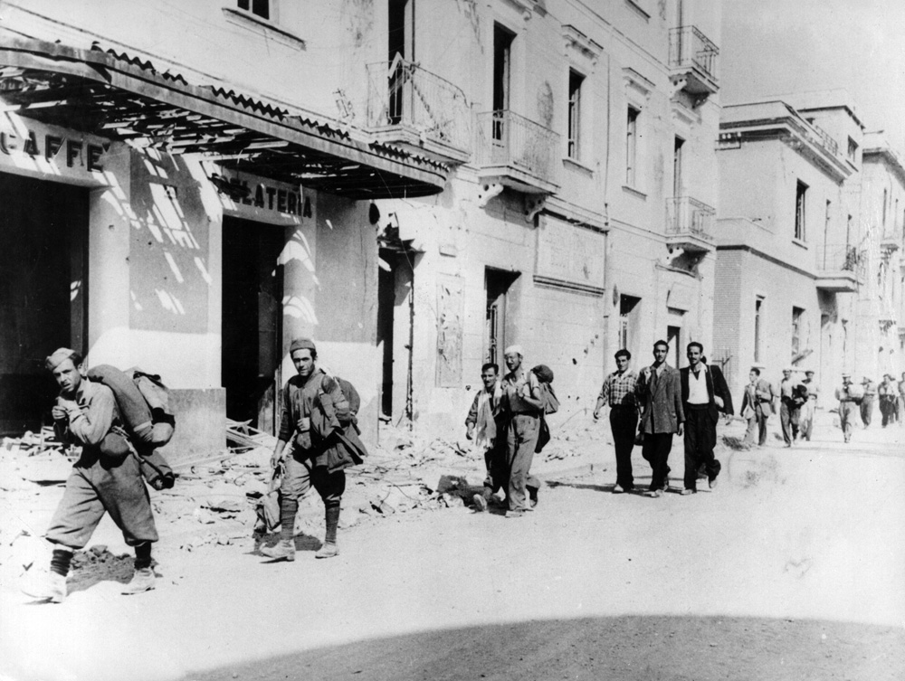Battipaglia, settembre 1943. Soldati italiani in abiti civili tornano a casa dopo l’armistizio dichiarato dal Governo italiano.