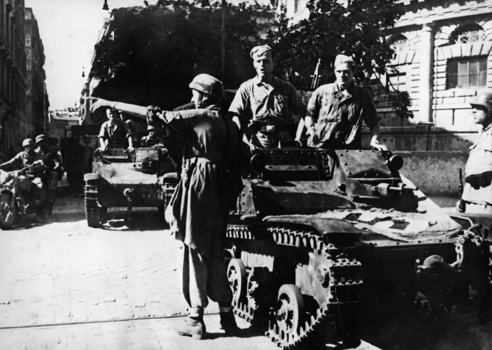 10 settembre 1943. Dopo l’armistizio tra l’Italia e gli Alleati, Roma viene occupata dai tedeschi: un paracadutista accanto a un convoglio della Wehrmacht.