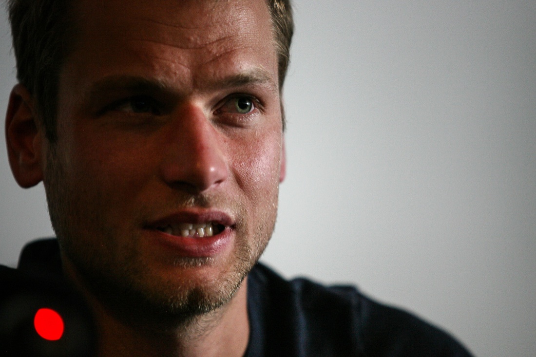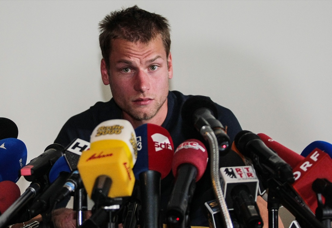 Alex Schwazer, medaglia d’oro a Pechino, durante la conferenza stampa in cui dichiara di aver fatto uso di sostanze dopanti nel 2012