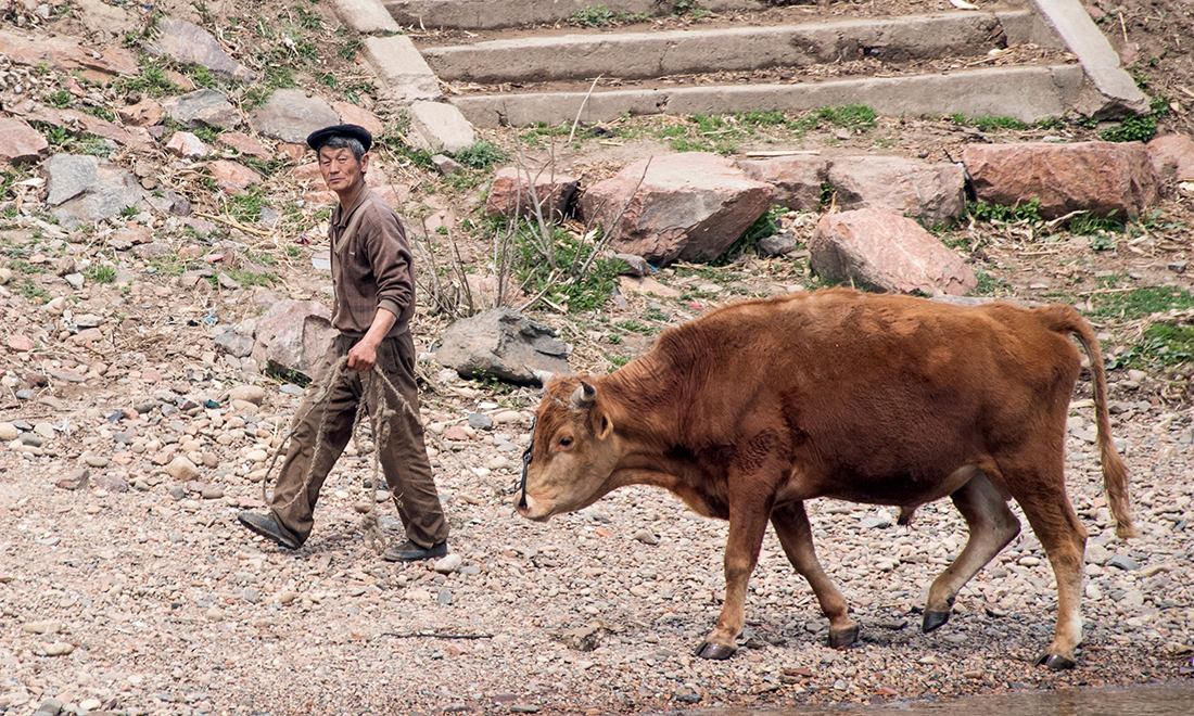 15 aprile 2017. Un uomo cammina seguito da una mucca lungo le rive del fiume Yalu, nei pressi di Sinuiju, vicino alla città di confine di Dandong, in Cina.