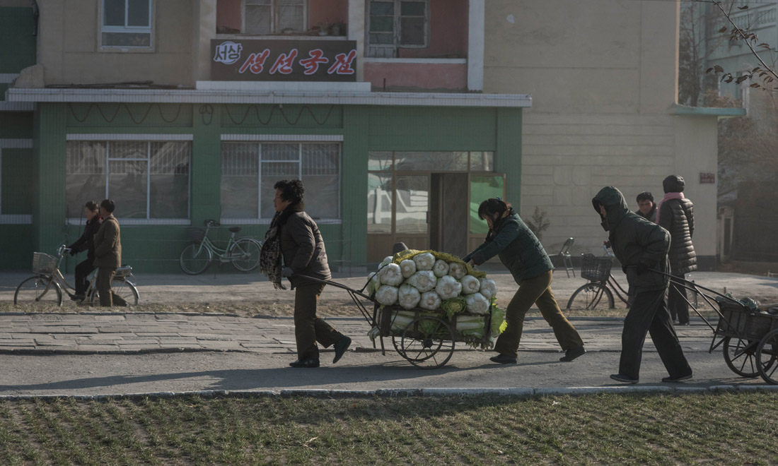 Gente del posto spinge un carrello che trasporta cavoli, Hamhung, città sulla costa nord-orientale della Corea del Nord.
