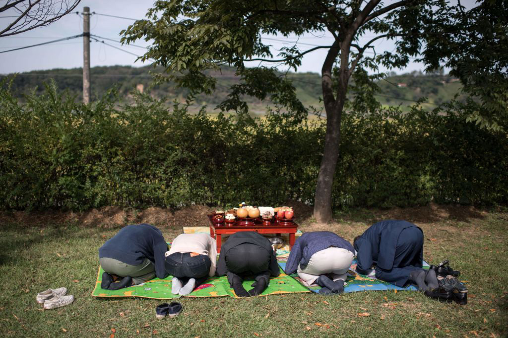 Una famiglia si inginocchia di fronte alle rete che divide la Corea del Nord a quella del Sud presso la zona demilitarizzata (DMZ) di Imjingak il 4 ottobre 2017
