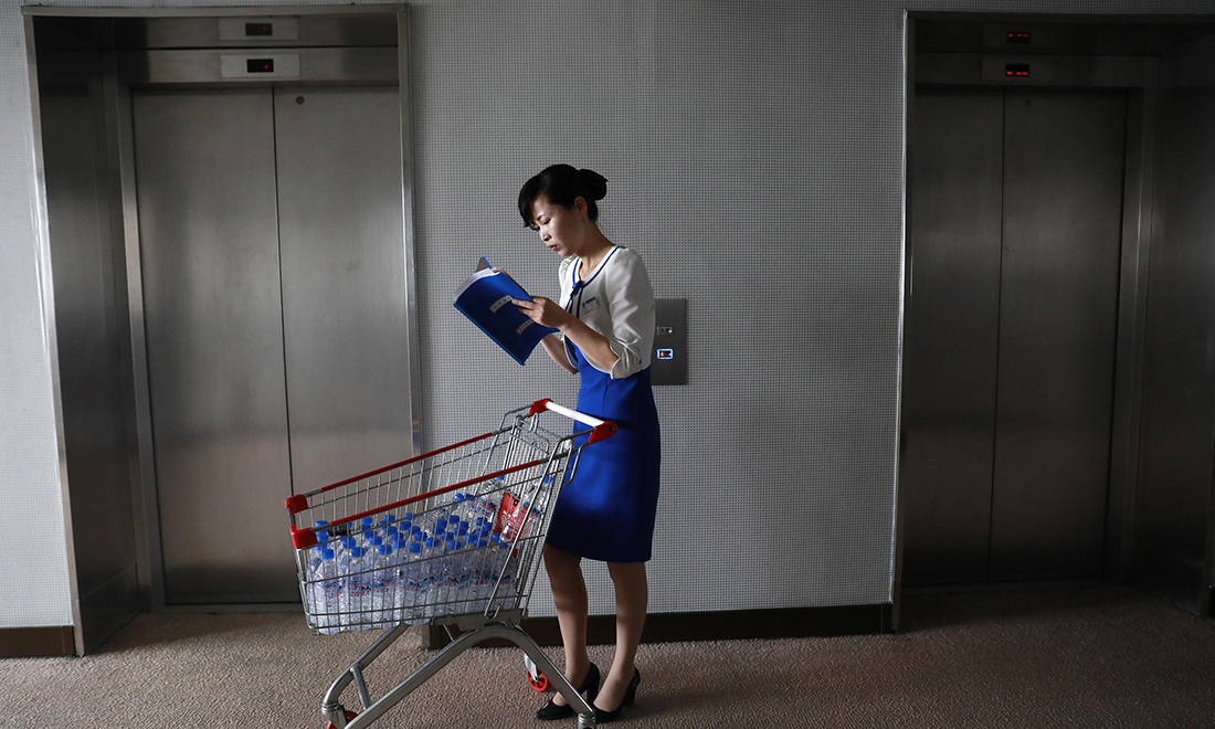 16 aprile 2017. Una donna impiegata in un hotel di Pyongyang, in Corea del Nord, attende un ascensore per trasportare bottiglie d’acqua con un carrello.