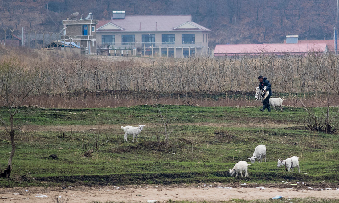 14 aprile 2017. Un pastore con alcune pecore sulle rive del fiume Yalu, nei pressi di Sinuiju, vicino alla città di confine di Dandong, in Cina.