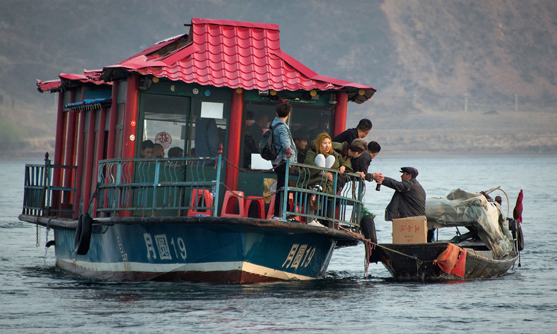15 aprile 2017. Un uomo vende dei prodotti nordcoreani a dei turisti cinesi, lungo il fiume Yalu, nei pressi di Sinuiju, in una foto scattata dalla sponda cinese del corso d’aqua di confine, nei pressi di Dandong. Questa città della Cina è il principale punto di attraversamento della frontiera, da cui ogni giorni centinaia di turisti cinesi si muovono a bordo di piccole barche per una crociera sul fiume Yalu, da cui possono dare uno sguardo fugace a “un altro mondo”.