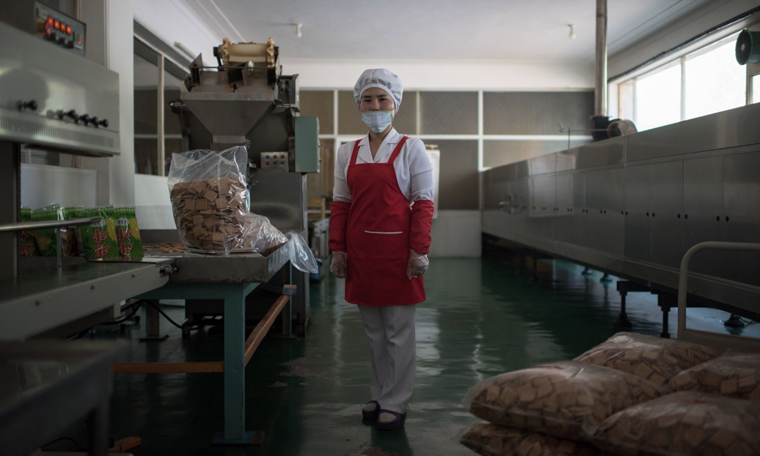 Choe Ok-Ju. 26 anni, posa per un ritratto dentro la fabbrica di prodotti alimentari dove lavora, nella città orientale di Wonsan, Corea del Nord, 11 aprile 2017.