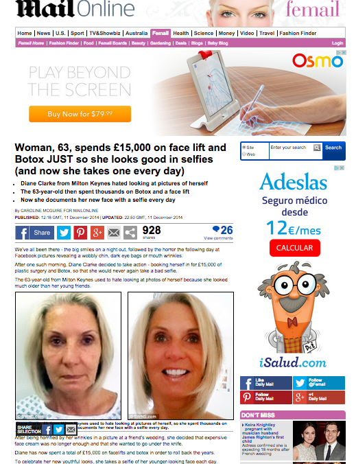 La mania dei selfies non conosce né età né origine geografica . Arriva dall’Inghilterra la storia della sessantatrenne Diane Clark che, stufa di apparire brutta in tutti i selfie che si scattava, ha preso in mano la situazione e si è rivolta al chirurgo plastico.
