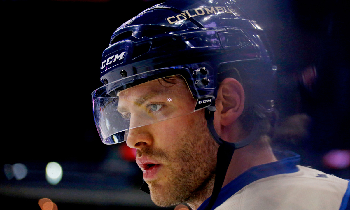 3 gennaio 2017. Il giocatore di hockey su ghiaccio Boone Jenner dei Columbus Blue Jackets durante il riscaldamento prima di una partita contro gli Edmonton Oilers alla Nationwide Arena di Columbus, in Ohio.