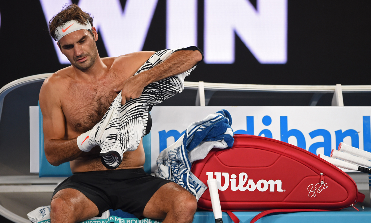 16 gennaio 2017. Il tennista svizzero Roger Federer si cambia la maglietta durante una partita del singolare maschile contro Jurgen Melzer (Austria), nel corso degli Australian Open di Melbourne, in Australia.
