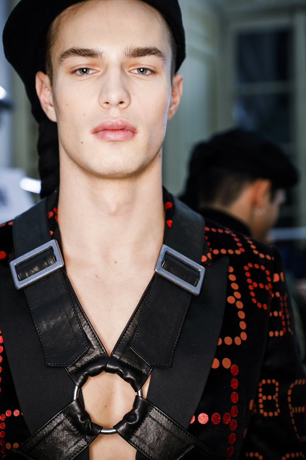 22 gennaio 2017. Un modello nel backstage della sfilata Rynshu, Autunno/Inverno 2017-2018 nel corso della Paris Fashion Week a Parigi, in Francia.