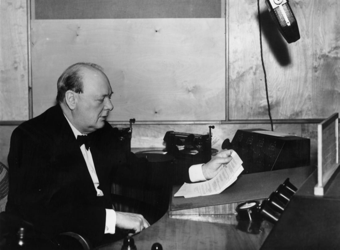 Churchill durante un discorso radiofonico ai microfoni della BBC