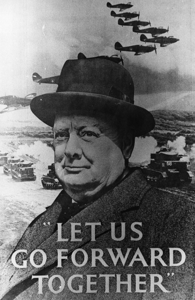Un messaggio alla nazione con l’effigie di Churchill del 1942: “andiamo avanti insieme!”.