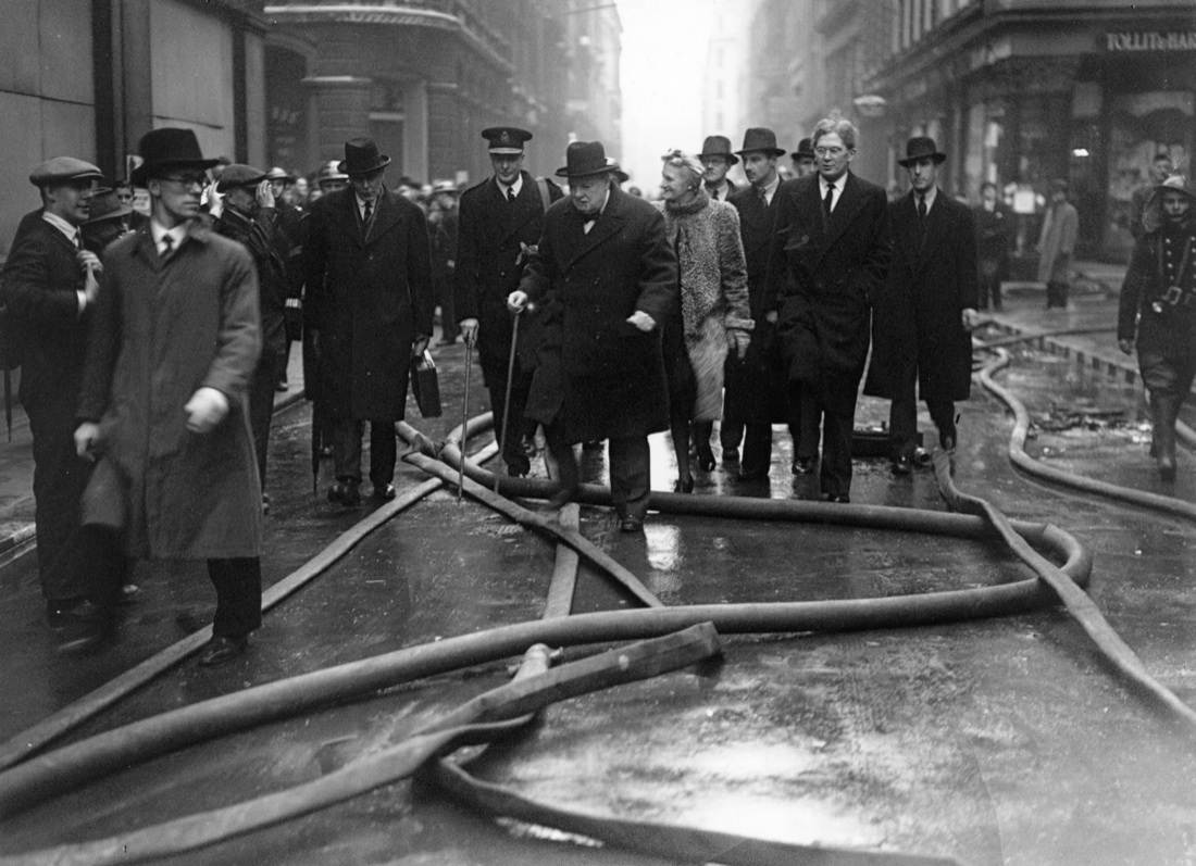 Churchill tra le macerie di Londra dopo un bombardamento tedesco nell’estate 1940.