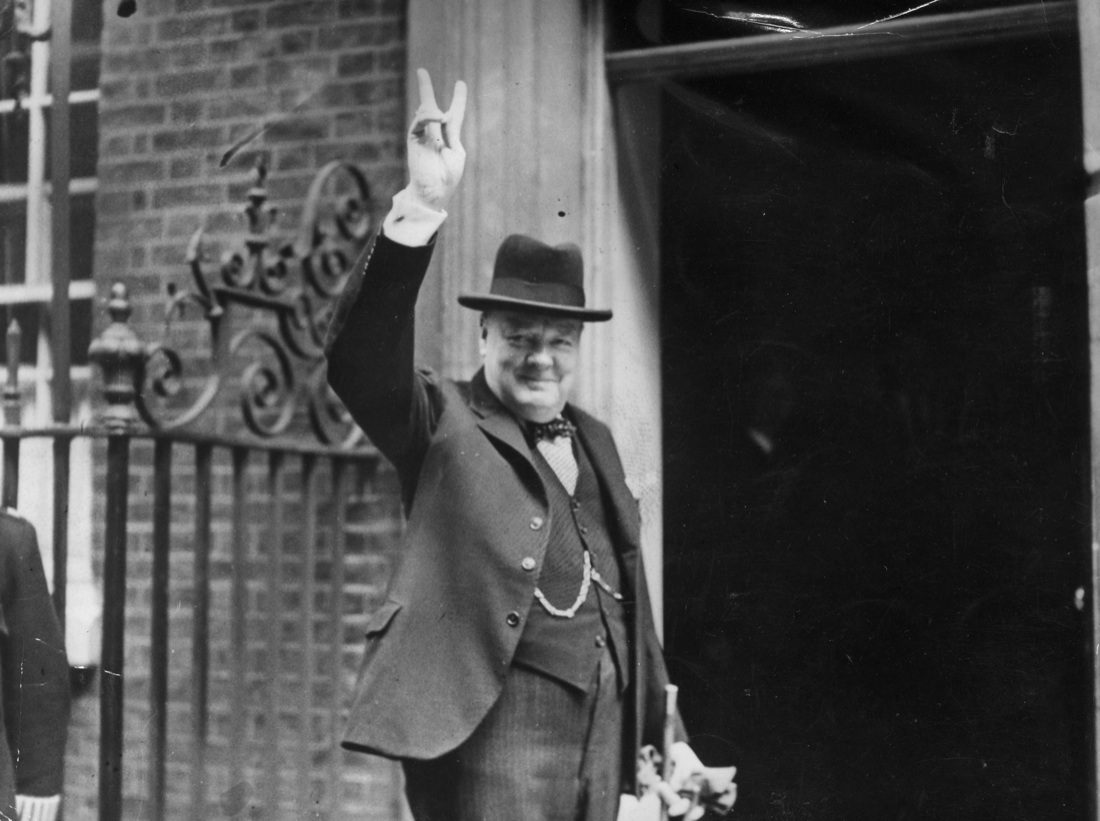 Il premier britannico Sir Winston Churchill fa il tipico gesto della “vittoria” davanti a 10 Downing Street.