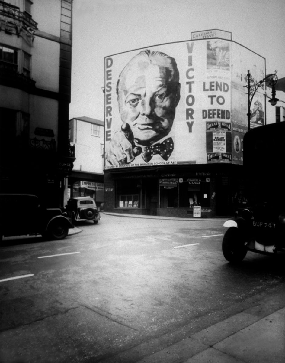 Un maxi poster di Churchill campeggia su un edificio di Londra nel 1940