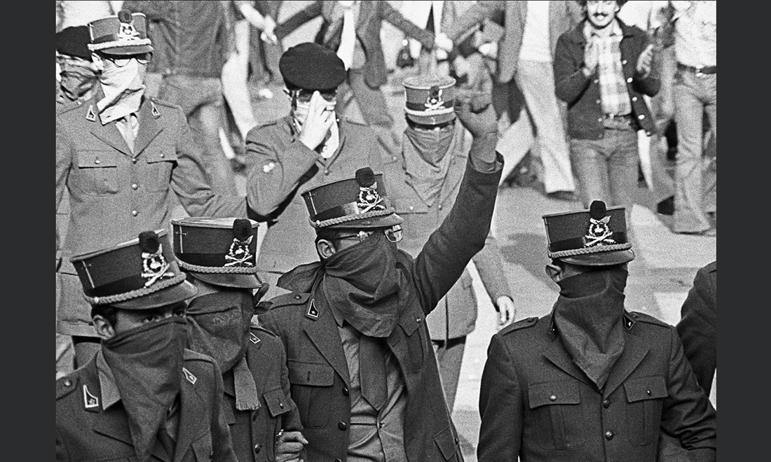 Milano, 25 aprile 1975. – Militari di leva salutano a pugno chiuso alla manifestazione indetta contro la mancanza di democrazia nelle caserme. La manifestazione, organizzata da Proletari in divisa, vicini a Lotta Continua, è stata convocata per il pomeriggio del 25 aprile, festa nazionale della Liberazione. I militari nascondono le facce perché, secondo le leggi dell’esercito, un militare non può partecipare a manifestazioni politiche indossando la divisa.