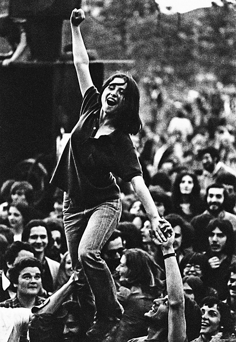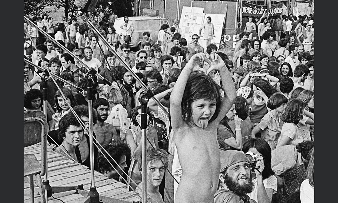 Milano, 1976. Sul palco del Parco Lambro, durante il festival organizzato da Re Nudo e dai gruppi extraparlamentari, una bambina fa il segno femminista.