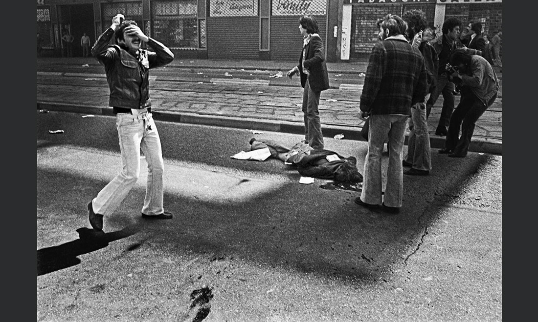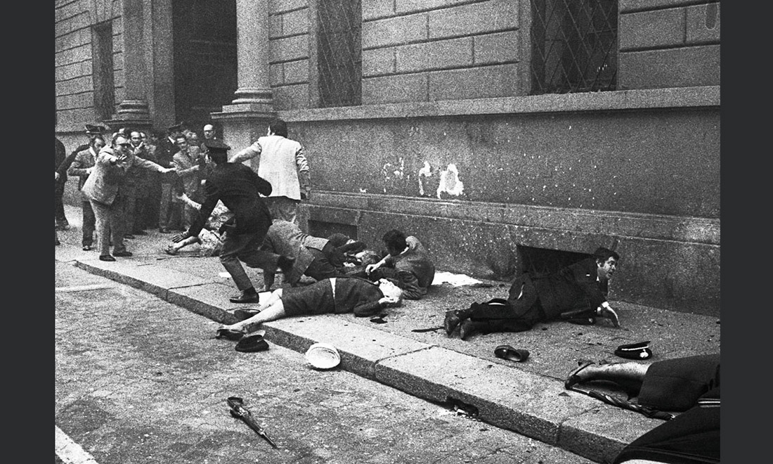 Milano, 17 maggio 1973. Gianfranco Bertoli lancia una bomba davanti alla Questura in via Fatebenefratelli. Vittime e feriti giacciono ancora sul marciapiede antistante.