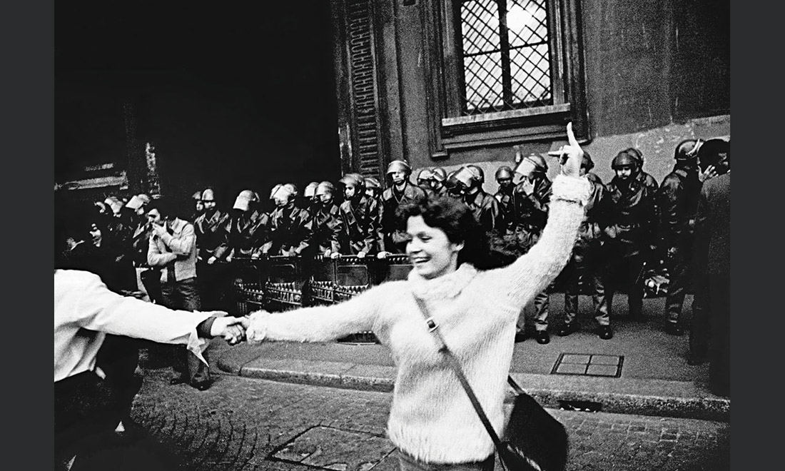 Milano, 1977. Ragazze ballano davanti al portone dell’Arcivescovado presidiato dalla polizia durante una manifestazione in difesa della legge sull’aborto. I movimenti e le istanze del ’68 terminarono in Italia negli anni Settanta, quando si scivolò lentamente negli “anni di piombo”. Di quel periodo molti ricordano solo la violenza e dimenticano che c’erano anche l’allegria e la spensieratezza, l’ironia, la creatività e lo sberleffo verso il Potere, che in quegli anni certo non mancarono, in particolare presso i movimenti delle donne.