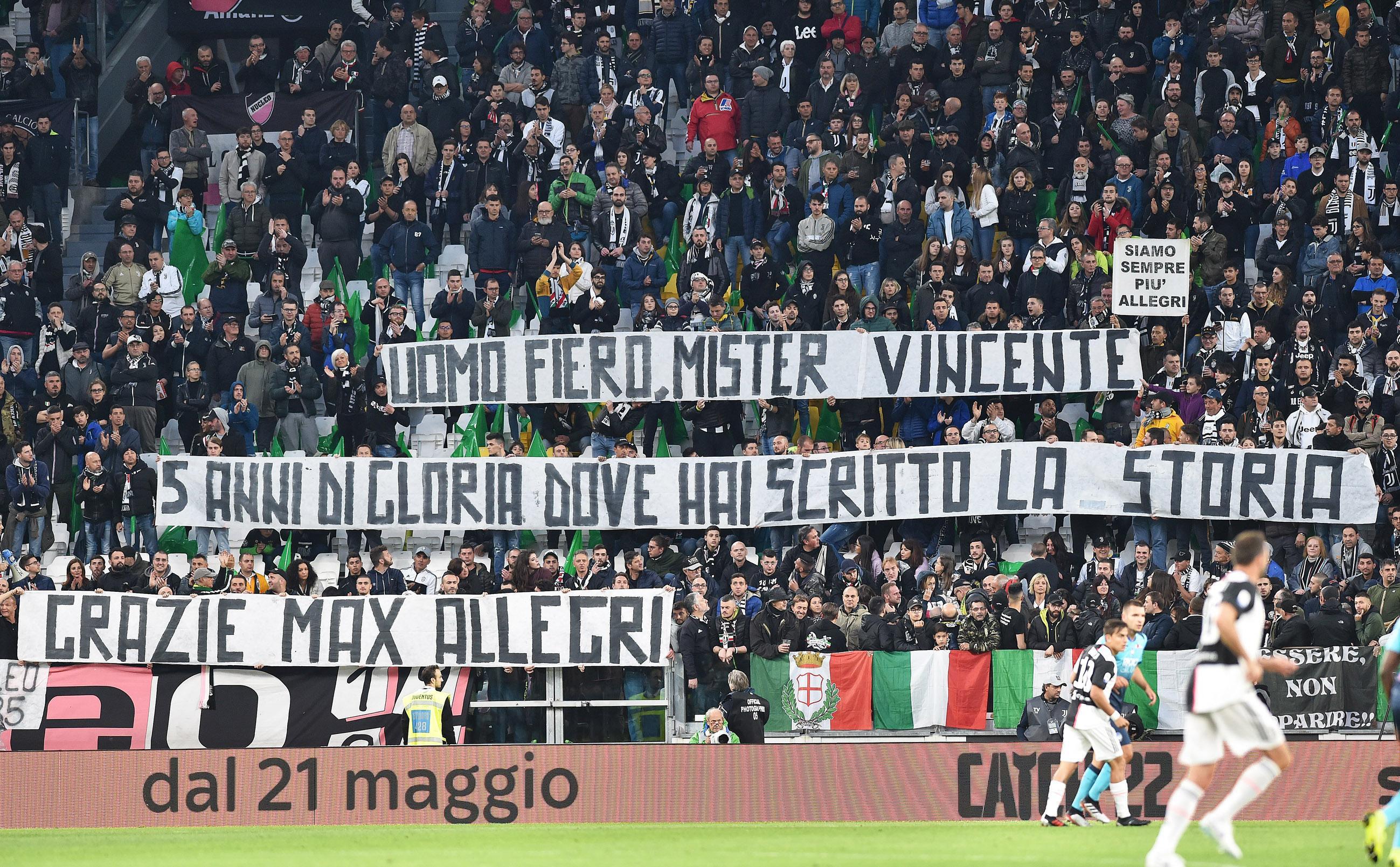 Applausi e striscioni per Allegri, tecnico spesso contestato e arrivato alla fine del suo ciclo di cinque anni dopo un clamoroso divorzio con la Juventus. La gente bianconera gli ha tributato il riconoscimento per gli undici trofei conquistati dal 2014, quando arrivò al posto di Conte in una delle estati più difficili della storia recente del club.