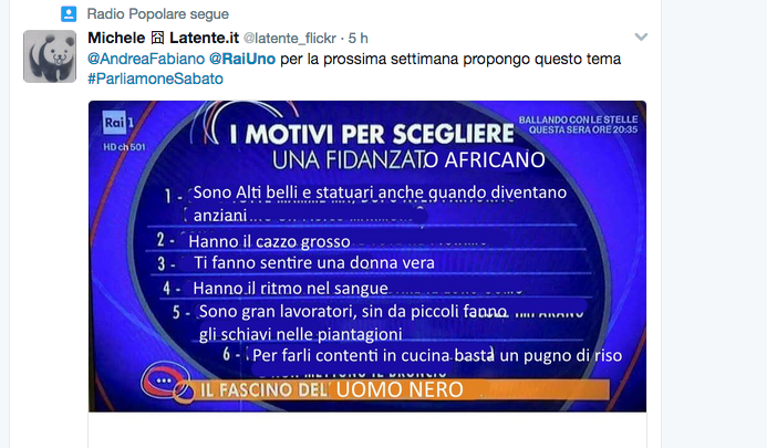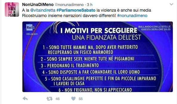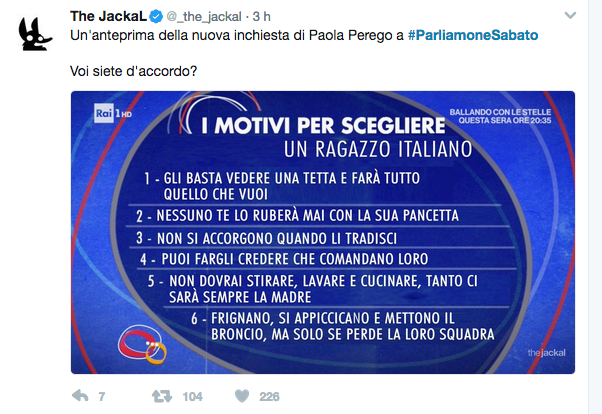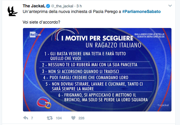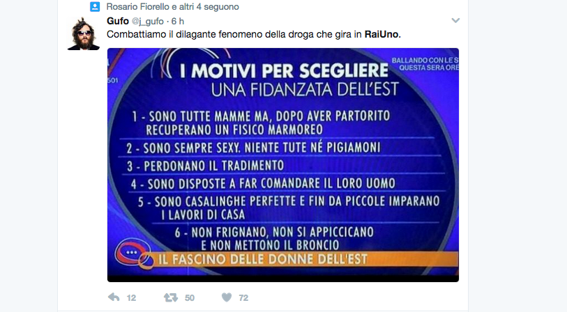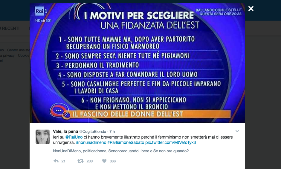 E’ davvero possibile che l’ammiraglia Rai abbia mandato in onda in una delle sue trasmissioni di punta, Parliamone Sabato condotto da Paola Perego, un elenco dei sei motivi per cui una fidanzata dell’est sarebbe migliore di una italiana? Per chi non abbia visto la puntata bastano pochi clic su Google per scoprire quello che è successo.