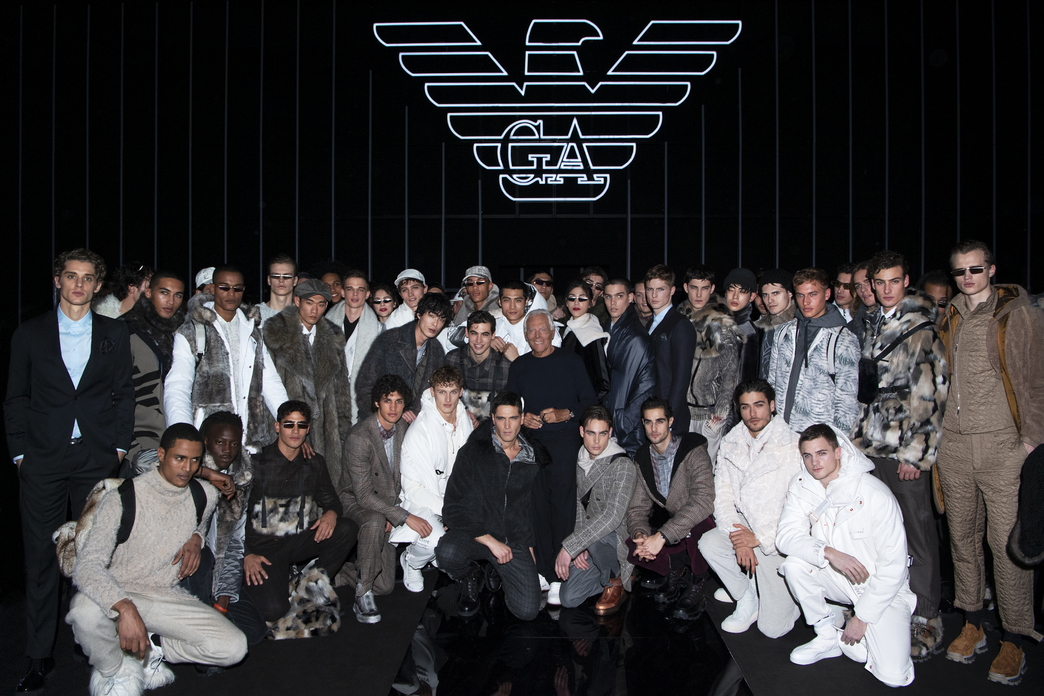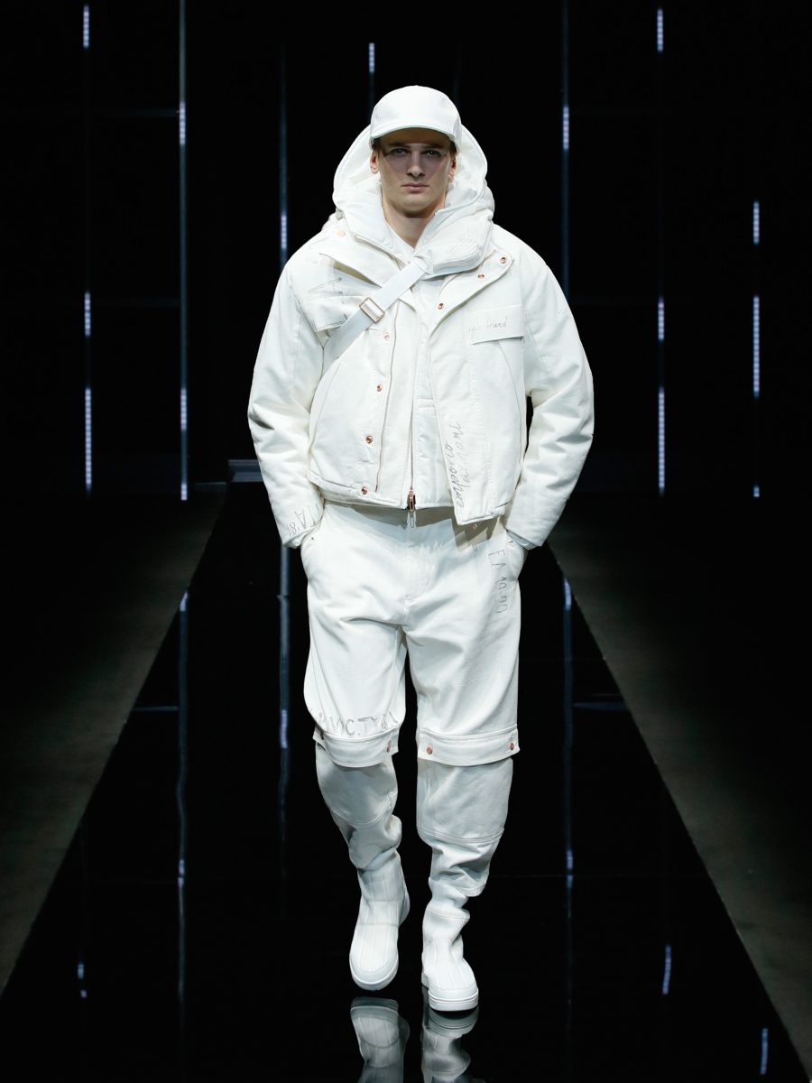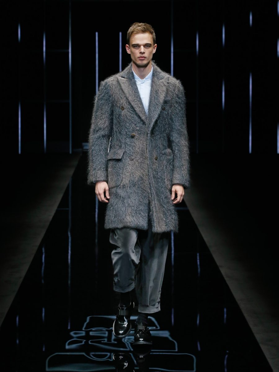 L’uomo di Emporio Armani è pragmatico e sportivo, vive in città ma appena può fugge negli spazi senza confine, in mezzo alla natura. Impegnato, attivo non disdegna l’ozio della vita all’aria aperta. Ha scarpe di pelo e si copre di pellicce ma sintetiche, voluminose, ricche, dall’aspetto selvaggio ma pur sempre eco. Nel rispetto della Natura che tanto ama. Cardature, lacerature, doppiature rendono materica la collezione che presenta una palette di colori perfettamente armaniana fatta di Bianchi ottici, bianchi freddi, note di grigi dalla patina brinata con qualche accenno di blu e di rosso. E se il pantalone morbido chiuso al fondo è ormai un lei motiv delle collezioni maschili di Armani, i volumi decisi di cappotti e di giubboni sono un’interessante novità.