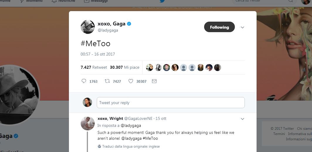 Lady Gaga, che in passato aveva denunciato uno stupro subito da giovane, si è limitata a condividere il #MeToo. Lo scandalo Weinstein, per ora accusato di aver molestato 30 donne, ha scoperchiato un vaso di Pandora di proporzioni immense creando però anche solidarietà tra le donne che, grazie alla Rete, non si sentono più sole e trovano il coraggio di denunciare i propri carnefici comprendendo finalmente di essere state vittime e non causa della molestia.