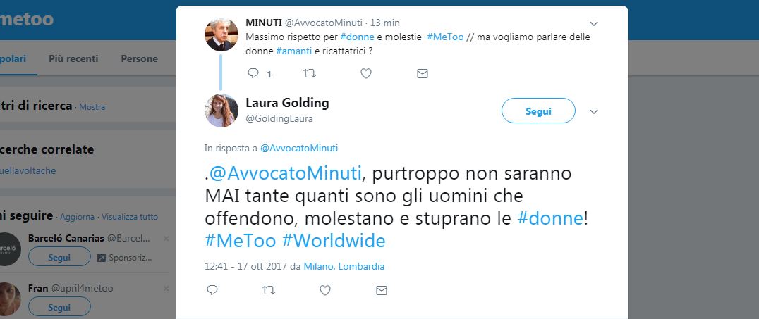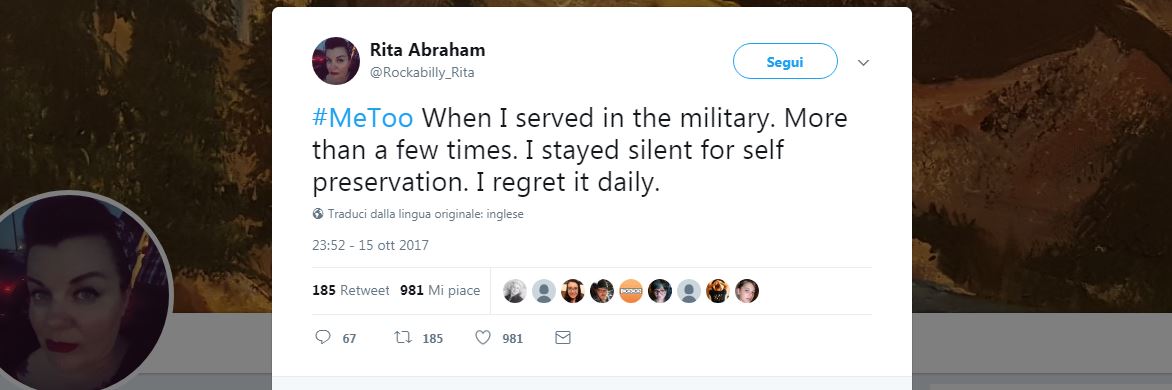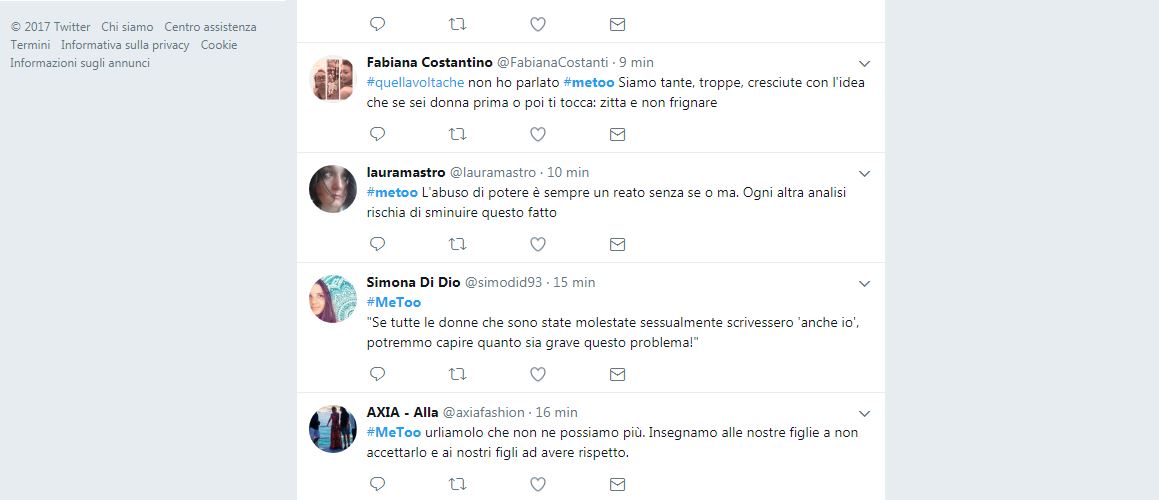 “#MeToo urliamolo che non ne possiamo più. Insegnamo alle nostre figlie a non accettarlo e ai nostri figli ad avere rispetto”. E’ uno dei migliaia di tweet che, seguendo l’hashtag #MeToo, denuncia le molestie sessuali, fisiche e psichiche subite dalle donne.