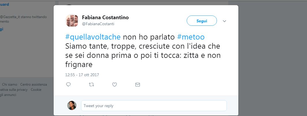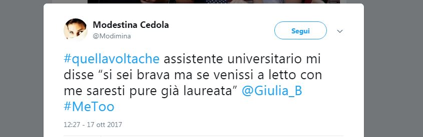 “Siamo tante, troppe, cresciute con l’idea che se sei donna prima o poi ti tocca: zitta e non frignare” scrive una donna mentre un’altra aggiunge: “L’assistente universitario mi disse: ‘Tu sei brava, ma se venissi a letto con me saresti laureata”. E poi ci sono le ragazze che si ricordano delle molestie subite a scuola, di quelle palpatine non gradite sin dalla più tenera età e altre che pensano ai colleghi di lavoro troppi audaci mentre una giovane cita l’esaminatore di scuola guida che le ha consigliato di mettere la gonna corta per fare l’esame con lui e passarlo.
