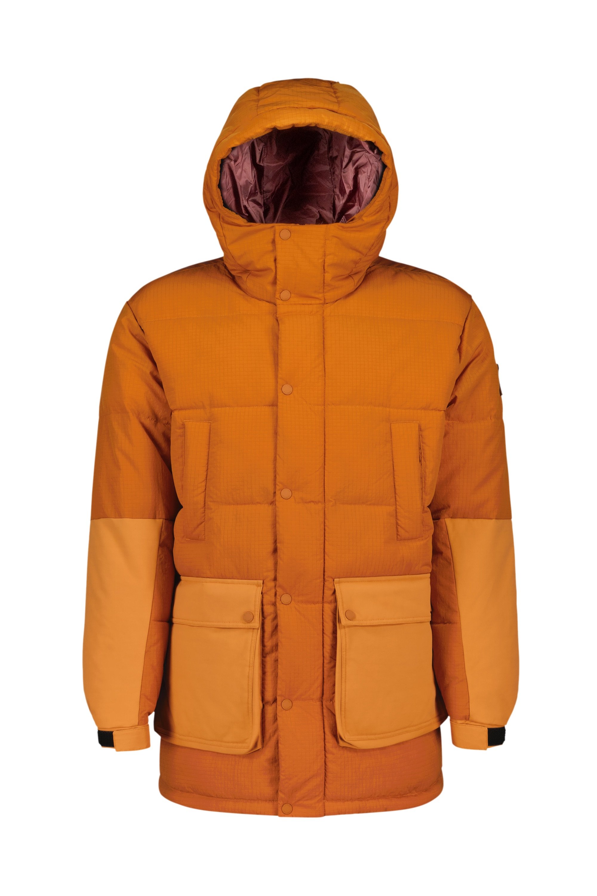 Giacca di media lunghezza con imbottitura in primaloft realizzata con tessuto macro ripstop ed inserto tonale in canvas.