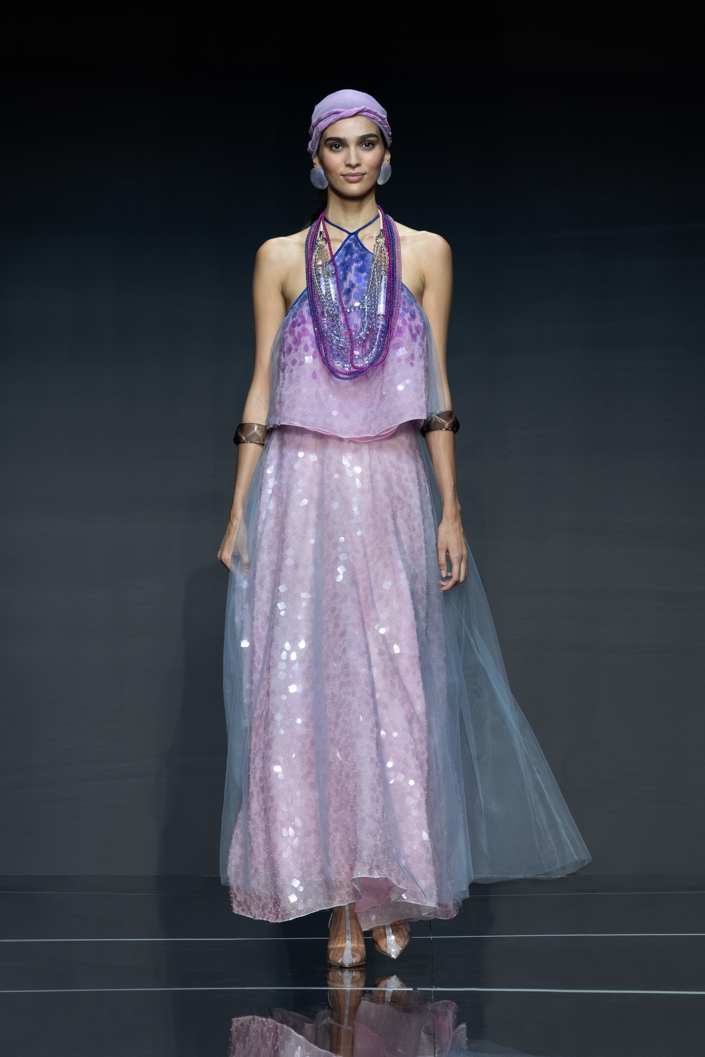 Gioia, sorrisi, serenità, rappresentano i volti delle modelle che indossano abiti dalle trasparenze discrete, paillettes e luccichii e colori confetto, rallentando il consueto incedere velocizzato dei palcoscenici della moda.