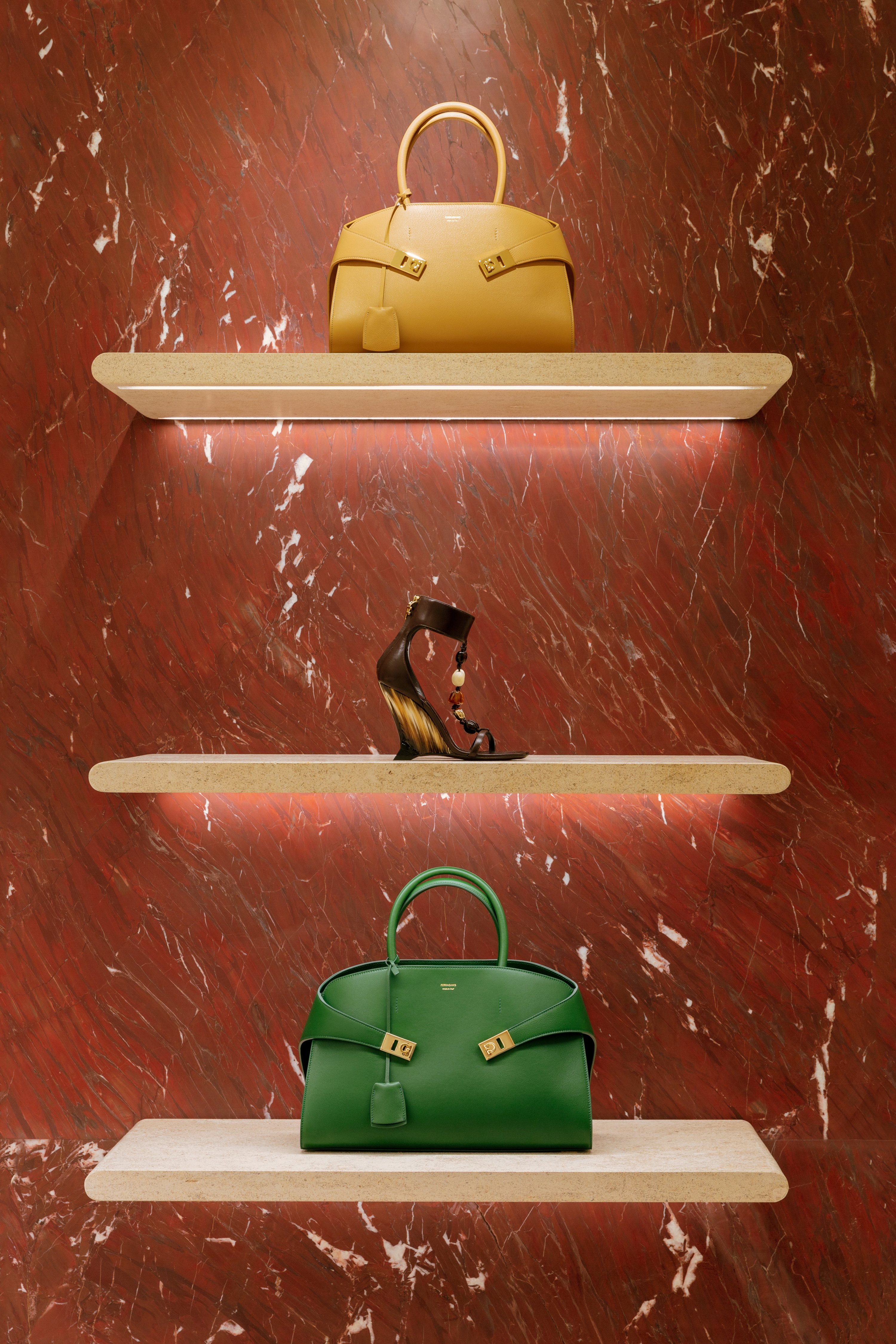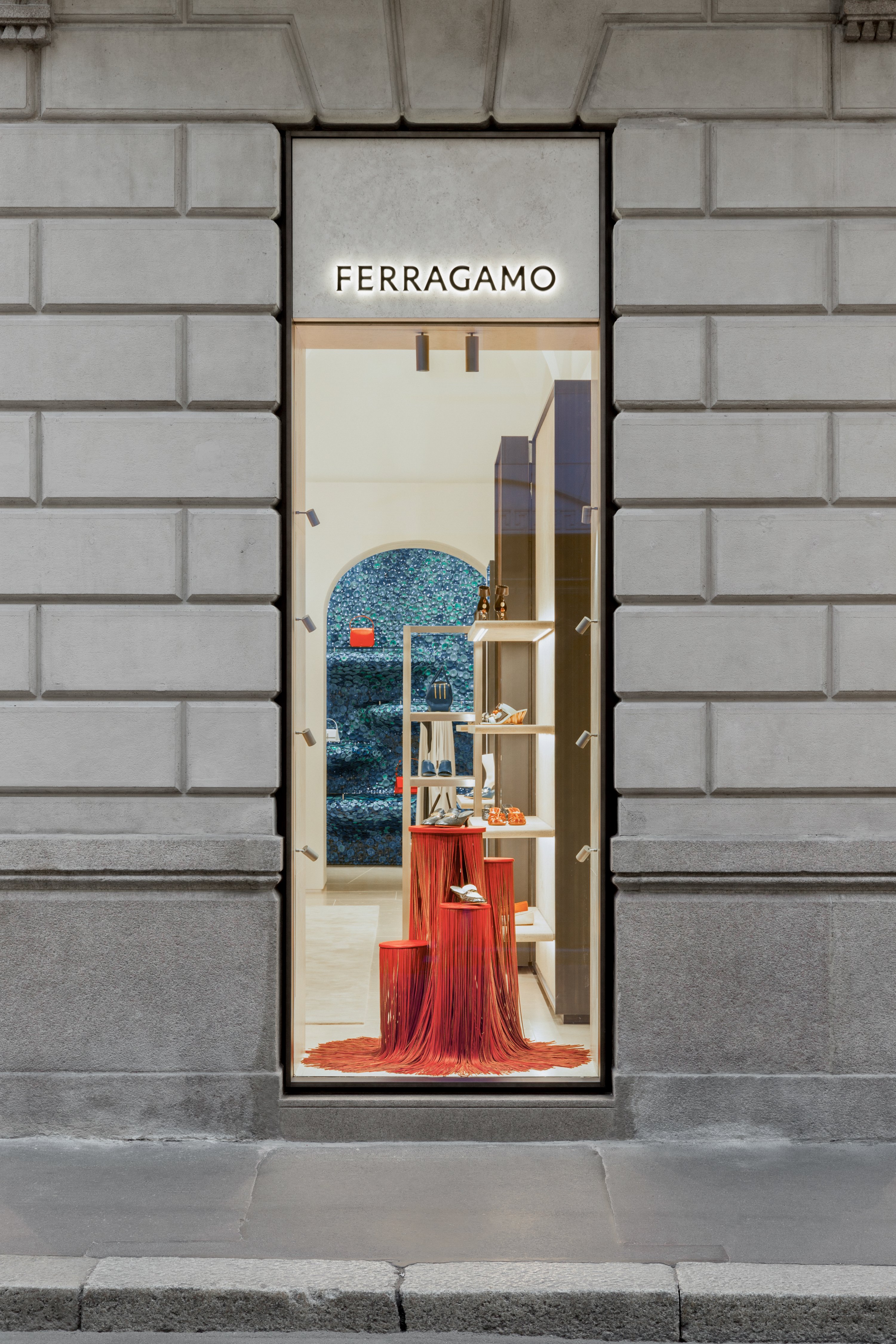 Nel complesso, quello cui ci si trova davanti è un progetto fatto di atemporalità, eleganza e calore raffinato, aperto anche alla sorpresa e alla sperimentazione. Gli spazi della boutique sono stati pensati per essere percorsi come se fossero gli ambienti di una grande casa, permeati da un senso di comfort raffinato. Ogni sala ha una sua anima ed è in risonanza con le collezioni che ospita, amplificandone il messaggio; tutte insieme trasmettono un flusso di energia, lo stile Ferragamo. Calzature, borse, accessori e abbigliamento sono disposti lungo un percorso di scoperta che culmina nell’ambiente dedicato alla seta, a cui si accede con una breve scala realizzata in pietra. Gli spazi sono punteggiati da pouf e poltrone che invitano a una sosta; davanti ai camerini, un vestibolo pensato come un salotto invita al relax e alla conversazione.