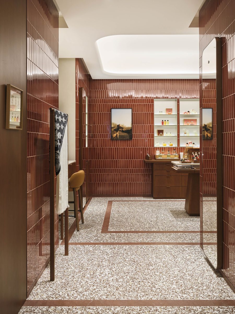 Lo studio parigino RDAI, che da sempre si occupa di interpretare il design, l’architettura e gli interni delle boutique Hermès, ha eseguito un lavoro magistrale creando ambienti armoniosi che comunicano tra loro attraverso una grammatica estetica coerente ed elegante ma soprattutto ha saputo rendere omaggio alla città e alla cultura fiorentina attraverso l’uso di materiali tipici della cultura toscana, marmi policromi che creano giochi grafici geometrici, richiami architettonici e le sfumature della terracotta e dei verdi naturali.