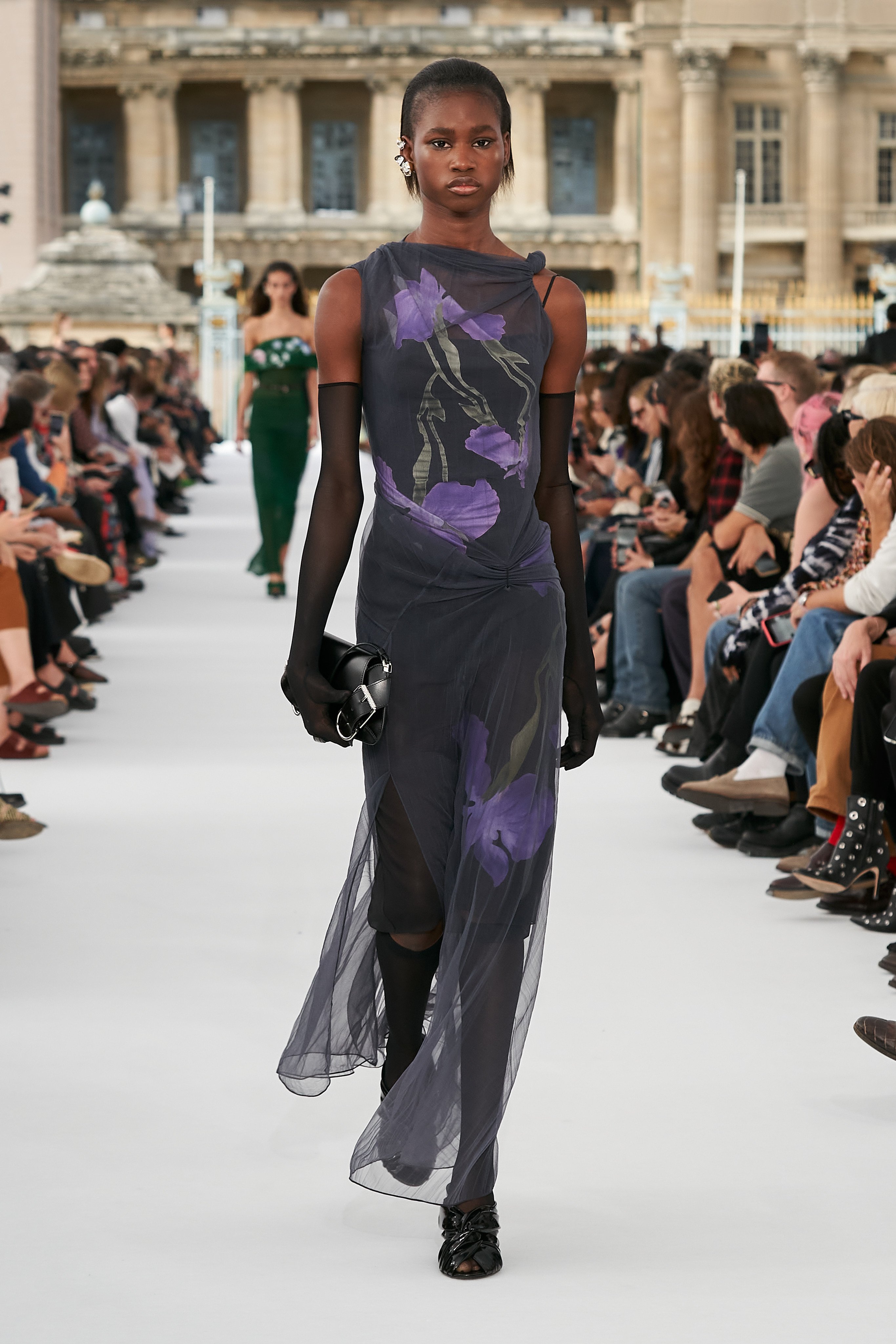 I fiori, motivo caro a Hubert de Givenchy, ripercorrono delicati la collezione, dipinti su organze e sete, mentre per la sera i lunghi abiti trasparenti in chiffon nero si arricchiscono di pizzi e drappeggi o semplicemente si sovrappongono a frange e a preziosi ricami in cristallo.