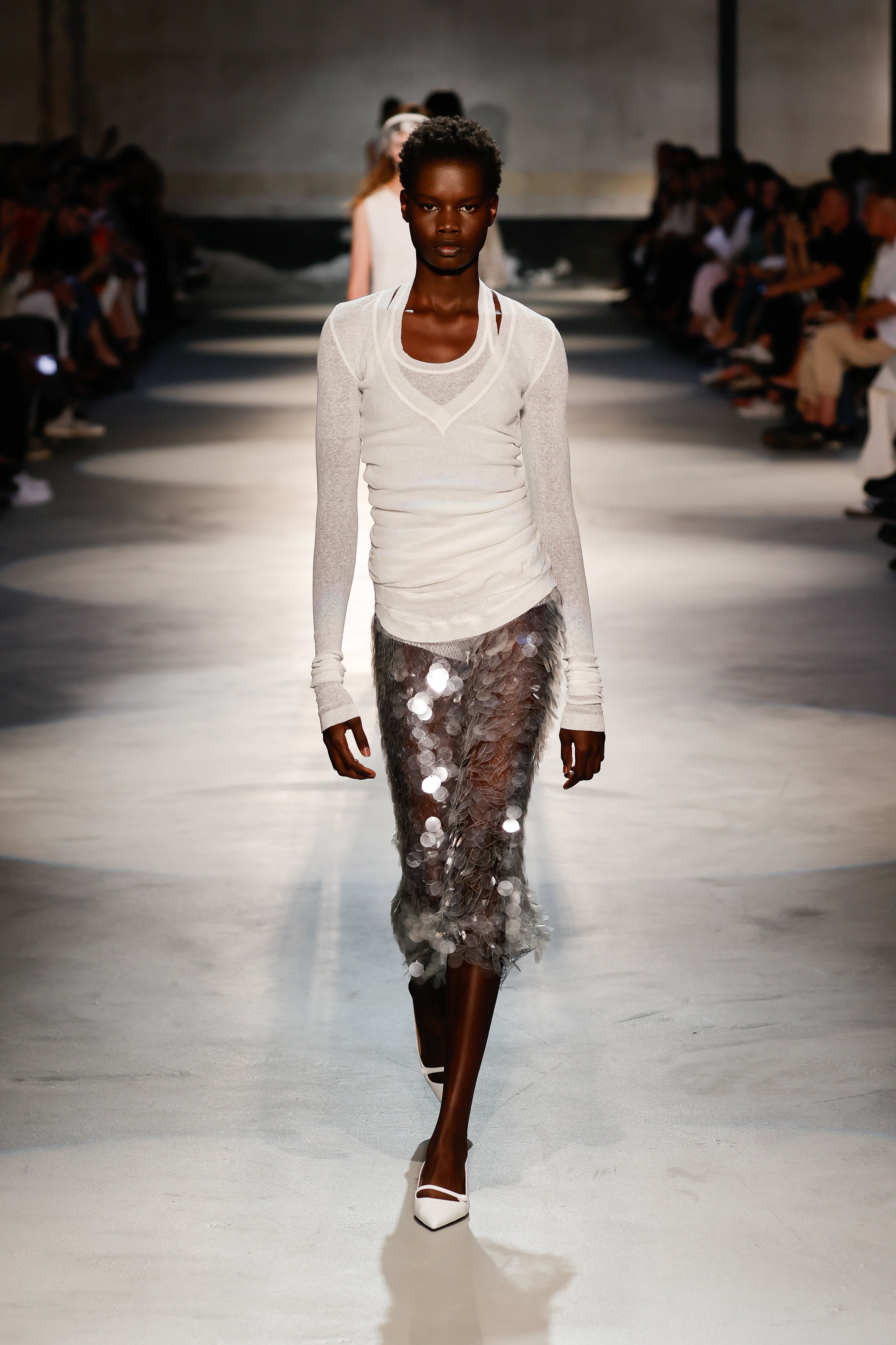 Minimale ma estremamente seducente è la maglieria di LGN Louis Gabriel Nouchi con un maglione nero dalla spalla scoperta, così come il crop top di Acne Studios dalle maniche lunghe.