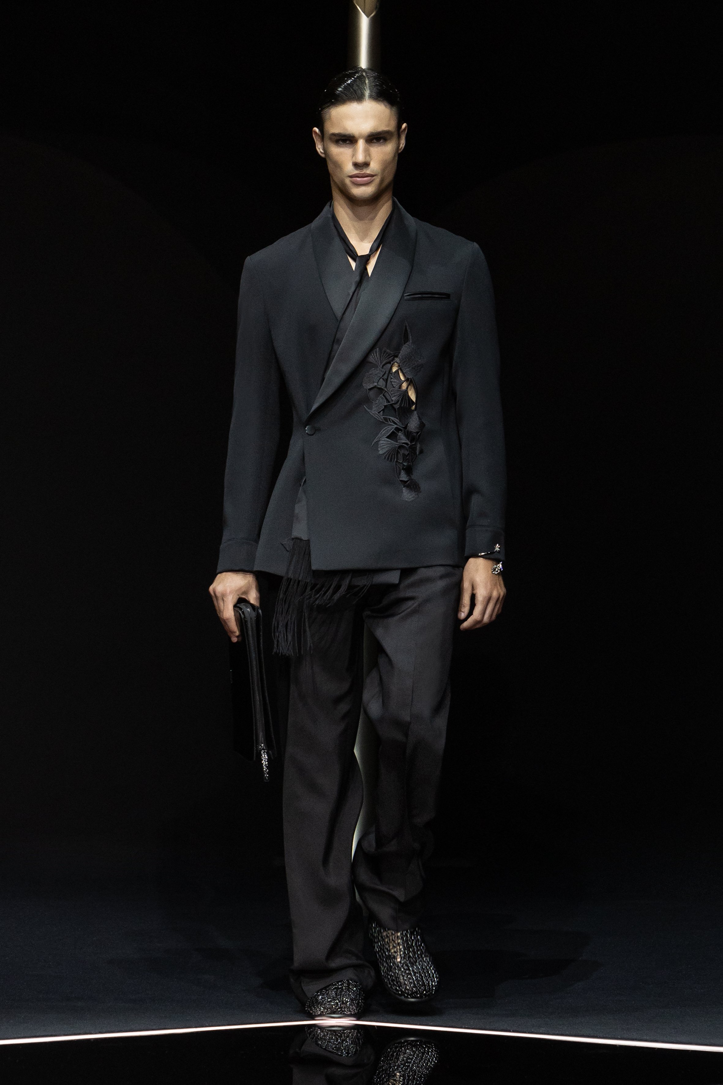 La palette cromatica prevalentemente neutra o scura regala ulteriore energia primitiva e pura. I capi sono pensati per scorrere su tutte le ore, perché la sera è un modo di essere, e anche di giorno si può brillare. Hanno un nuovo appeal contemporaneo le giacche kimono, i lunghi spolverini, i pantaloni danzanti molto ampi, le tuniche senza maniche e poi ancora le maglie riccamente ricamate e i blazer scintillanti.