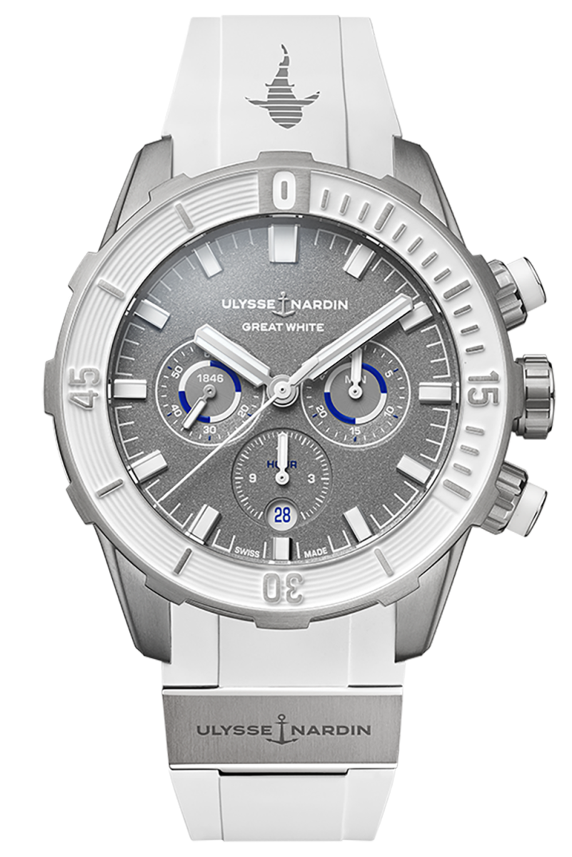 Great White di Ulysse Nardin, tecnologico segnatempo in titanio resistente fino a 300 metri, prende il nome dello squalo bianco maschio, predatore supremo che ha messo i brividi a subacquei, nuotatori, ma anche eroe dei mari, che compie una parte di equilibrio fondamentale nella catena alimentare dell’ecosistema oceanico. Considerato uno fra i migliori orologi tecnici per l’esplorazione, è anche attore di una serie di iniziative per la salvaguardia degli squali e della sostenibilità del pianeta acqua.