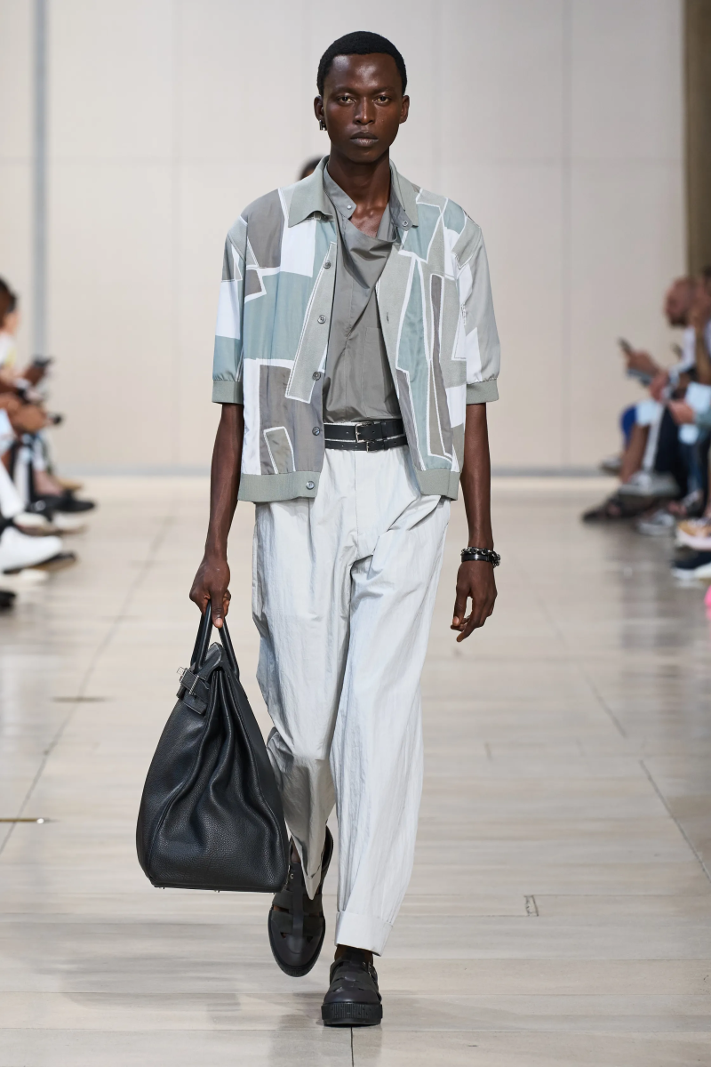 L’estate è serena e gioiosa, l’aria è fresca, l’allure è inequivocabilmente sensuale, e così Véronique Nichanian porta in passerella camicie leggere tagliate in materiali tecnici semitrasparenti, a scacchi con un motivo a griglia e abbinate a pantaloni altrettanto ariosi. Le giacche dei completi non sono aderenti, lasciando spazio per respirare letteralmente e metaforicamente.