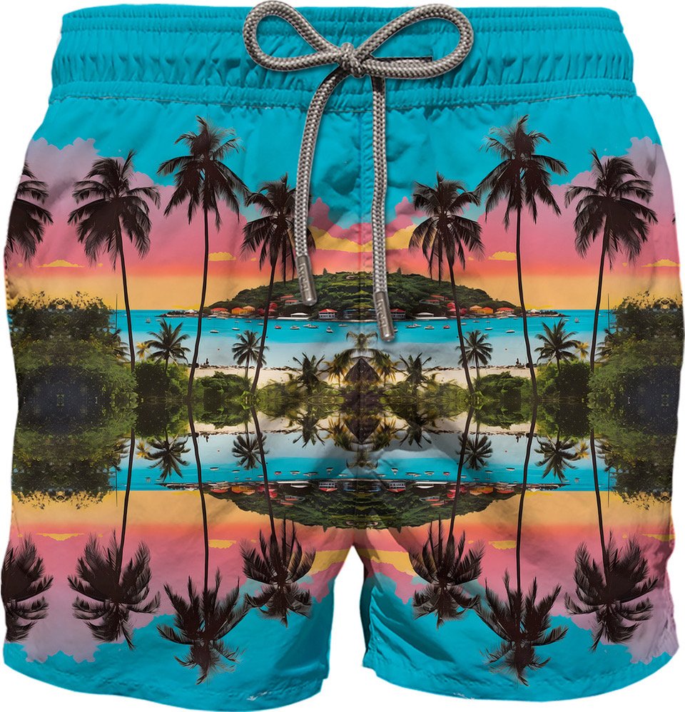 Il beachwear artigianale di Fiorio fa un viaggio nelle più belle località marine del sud, decorato con cuciture resistenti, asole, taschino sul retro e coulisse in vita.