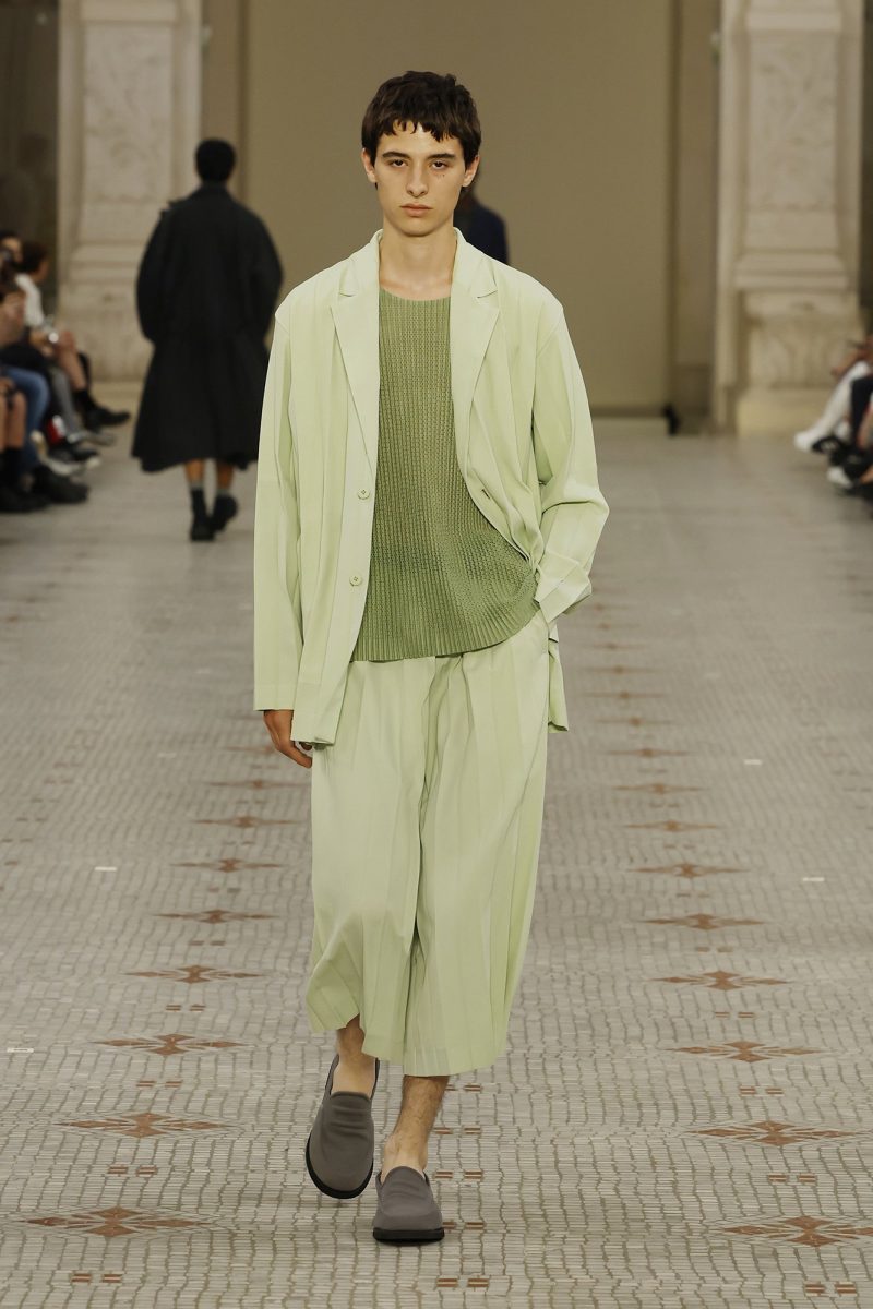 Le passerelle sembrano ormai abituate a questo tepore che trasmette l’estate, ed è per questo difficile lasciar andare delle nuance così pure. Ad esempio si può parlare di come Issey Miyake per la collezione womenswear realizza un look estivo estremamente glamour, con cappello, top e gonna bagnati di azzurro polvere mentre per il menswear opta per un morbido completo dalla nuance chiarissima che contrasta con il verde oliva della maglia.