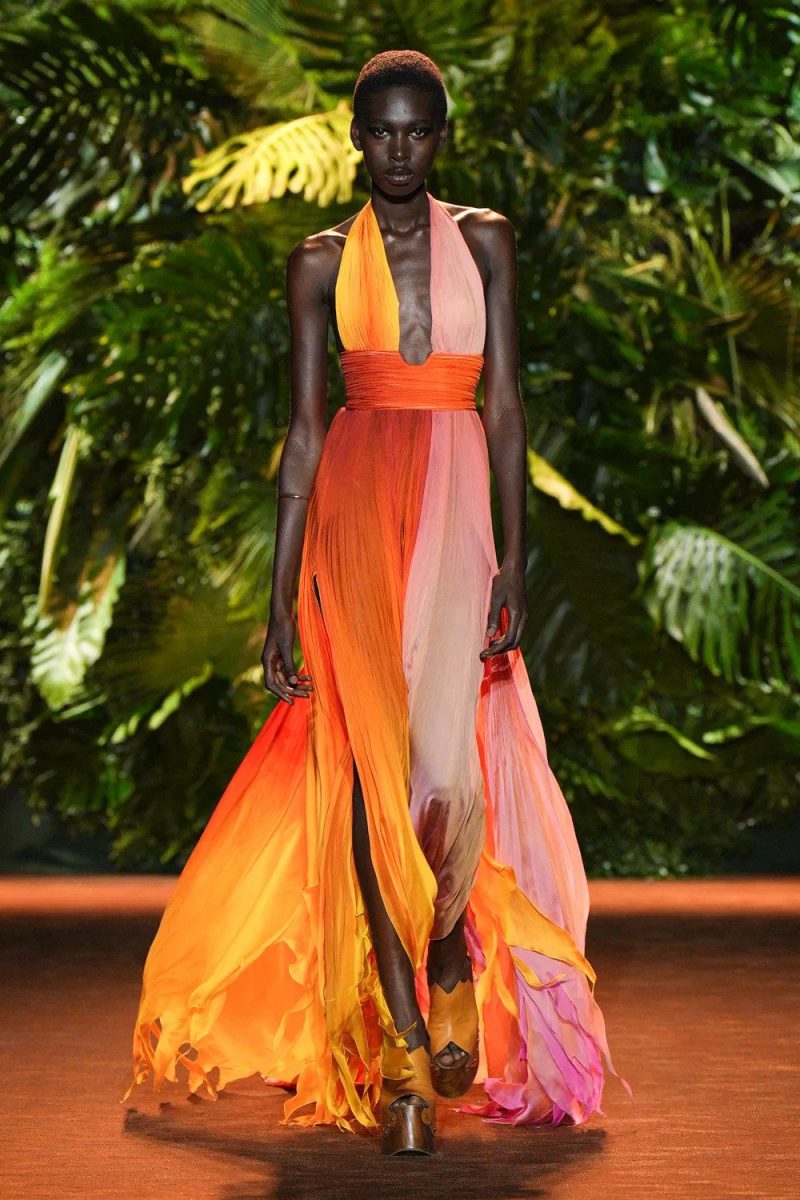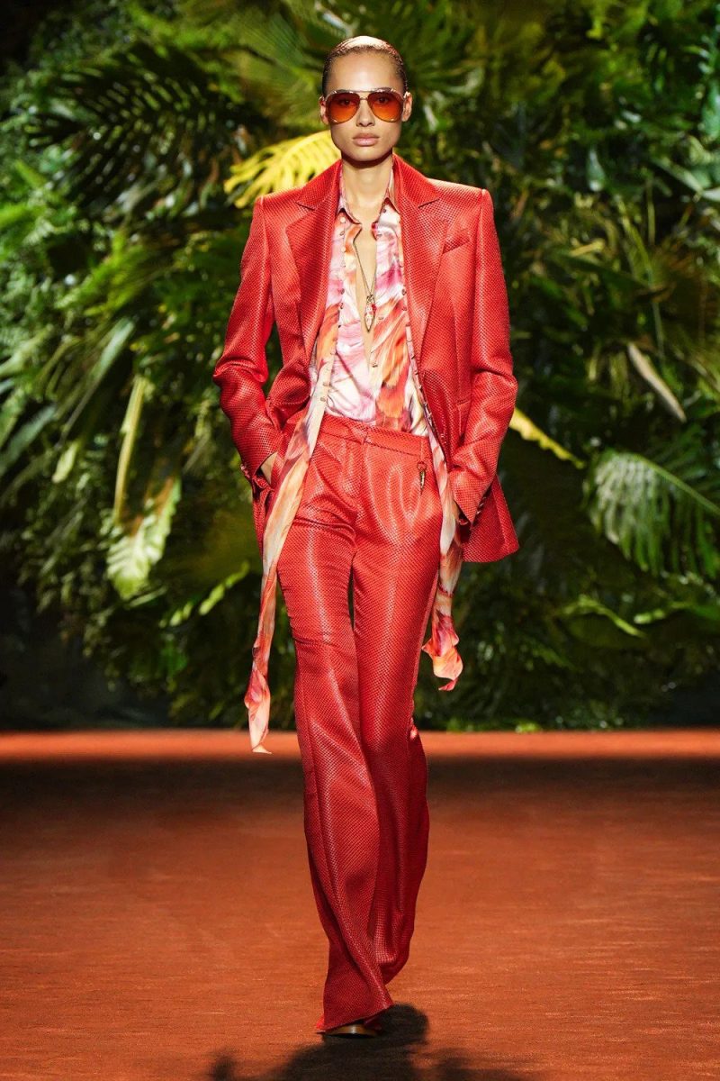 Abiti svolazzanti, kimono in seta stampata, pantaloni a zampa, tagli asimmetrici, giochi di trasparenze, silhouette da sirenetta. E ancora tailleur anni Settanta, frange lunghissime, piume e zeppe vertiginose.