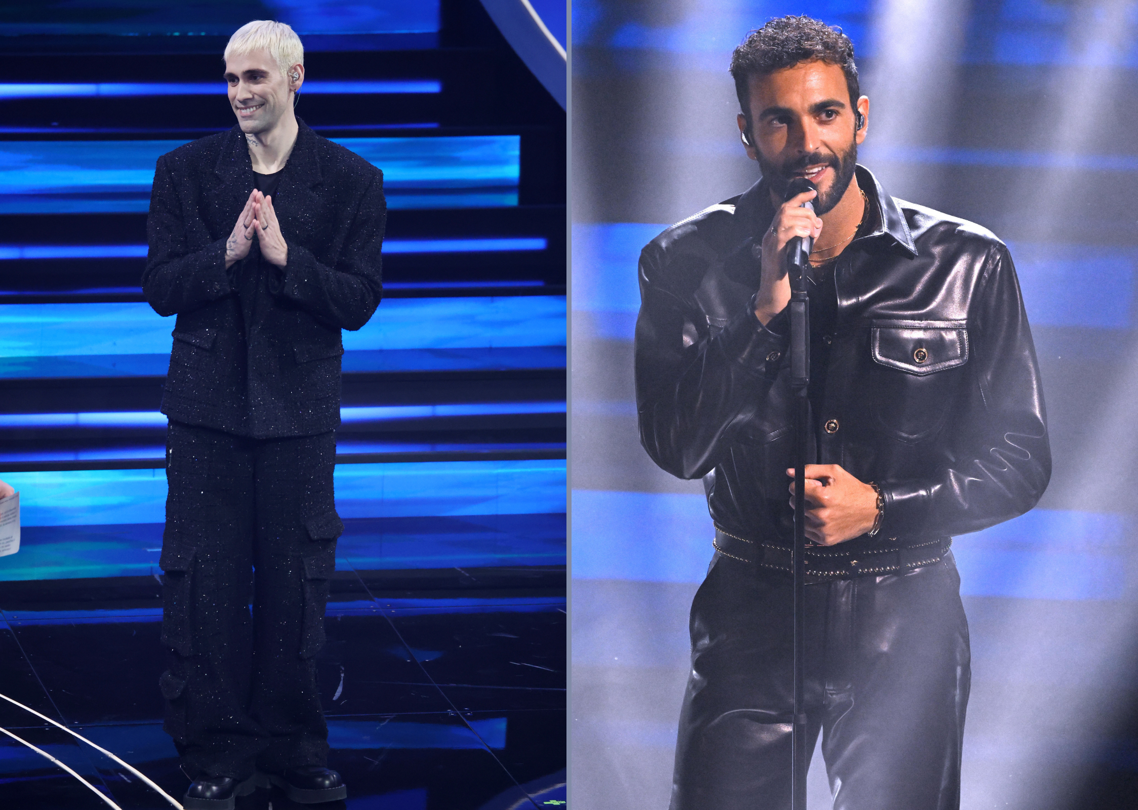 Non deludono (e come avrebbero mai potuto) i Cugini di Campagna, in un ensemble fatto di tute di paillettes argento e scarpe con la zeppa. Olly indossa un look vibes anni Cinquanta di Çanaku, reso contemporaneo nelle forme, un suit in fresco lana che mantiene invariate le lavorazioni sartoriali e reso divertente attraverso lo styling di Lorenzo Oddo.