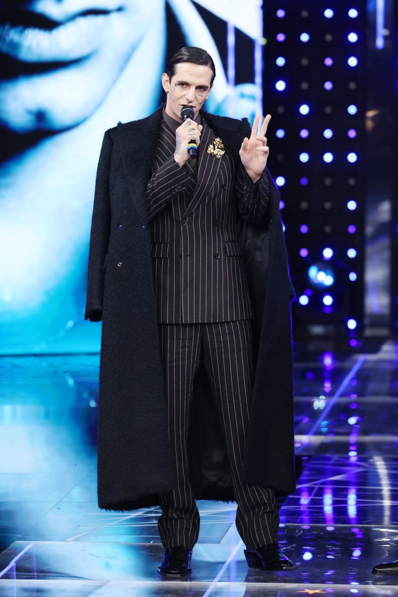 L’eclettico Achille Lauro torna a Sanremo in un total look Dolce&Gabbana. Completo gessato e cappotto appoggiato sulle spalle. A spiccare è però la spilla appuntata sul bavero.