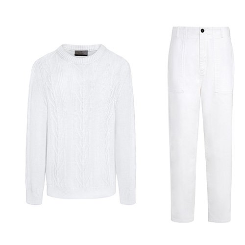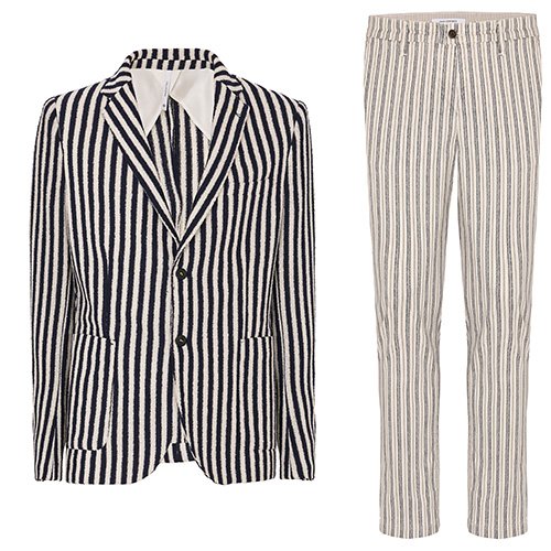 Anche Canali si fa portavoce del concetto sartoriale «Smartorial» frutto della ricerca di tutto ciò che collega il mondo del formale a quello del leisurewear, come i pantaloni bianchi in medley con maglie tricot in cotone. Le righe marinare sono celebrate da Alessandro Gilles nella estetica retrò che combina comodi pantaloni alla giacca rigata.