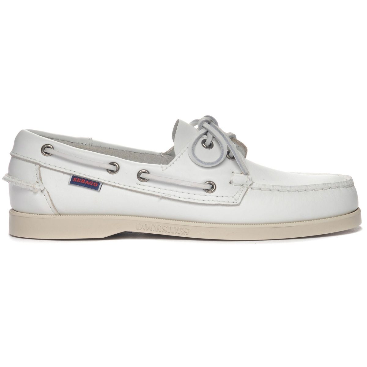 La scarpa da barca di Sebago è realizzata con un unico pezzo di pelle e cucita a mano sopra la suola in gomma striata antiscivolo, un gioiello di cura artigianale.