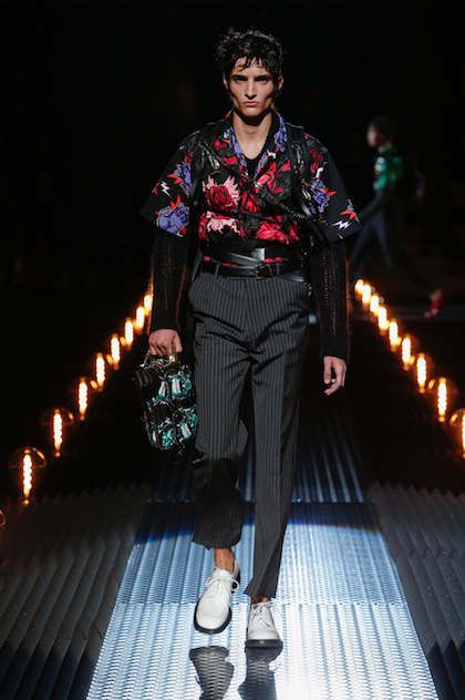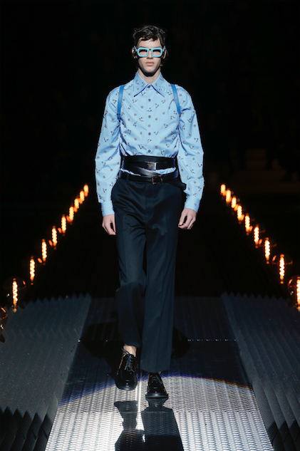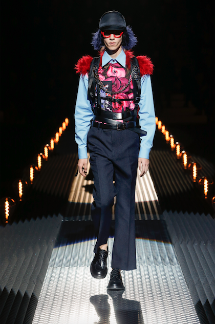 “Sono sempre infastidita dall’impossibilita della moda di parlare del mondo circostante in maniera incisiva, la moda non può cambiare il mondo, non lo fa neppure la politica, ma può e deve essere sensibile alla riflessione sul presente. Così con leggerezza ho voluto pensare a una collezione che parlasse di umanità, di vicinanza alle persone neglette” racconta Miuccia Prada tentando di far capire il lavoro complesso che c’e dietro a una collezione non solo a livello di stile ma anche di pensiero. Perché le due cose non possono essere scisse se si vuol dare contenuto alla forma. E Prada, come sempre e in particolare modo in questa stagione che in qualche maniera ritorna alle origini, ci riesce proponendo una collezione rigorosa ma non seriosa con abiti dalle giacche scostate dal corpo e pantaloni larghi in fondo e corti alla caviglia, capispalla di stile militare, cappelli foderati di ecopelliccia dai colori azzardati, zainetti miinimi e una serie di tasche poste anche sulle maniche delle giacche per contenere piccoli oggetti di massima utilità perfetti per ogni evenienza. Significativa la scelta di far indossare l’abito sul corpo nudo, senza camicia, senza calze. Rigore anche nel colore nero, grigio antracite, verde militare, unica eccezione le scarpe rosse di vernice. In armonia con lo stile maschile anche gli abiti femminili, non pochi pezzi, con stampe floreali dal sapore romantico. Basta quindi con gli eccessi e l’overdress tanto cari agli asiatici. Qui è l’Europa che parla, quella che ha radici nel pensiero filosofico e politico. Un linguaggio quello di Miuccia serio ma non noioso, anzi leggero e per certi versi ironico soprattutto quando si rifà all’iconografia del cinema horror per filtrare il brutto che ci circonda e sdrammatizzare con dettagli di peluche colorati le spalle di giacche rigorose o di pull da indossare infilati nei pantaloni.